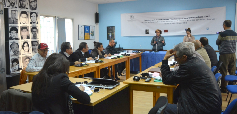 Les 6 et 7 février 2016 à Rabat, animée par Analia Simonetto Gonzalez de l'EAAF, cette formation a réuni une quinzaine de participants : médecins légistes, militants des droits humains, proches de personnes disparues et représentants d'institutions. Les deux axes principaux portaient sur la planification de l'identification lors des exhumations, et la collecte d'informations ante mortem et post mortem avec un focus sur les tests ADN.